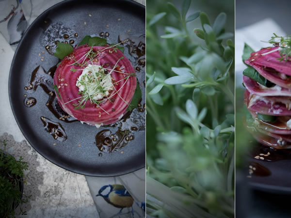 Millefeuille de betterave à la crème de feta et cresson