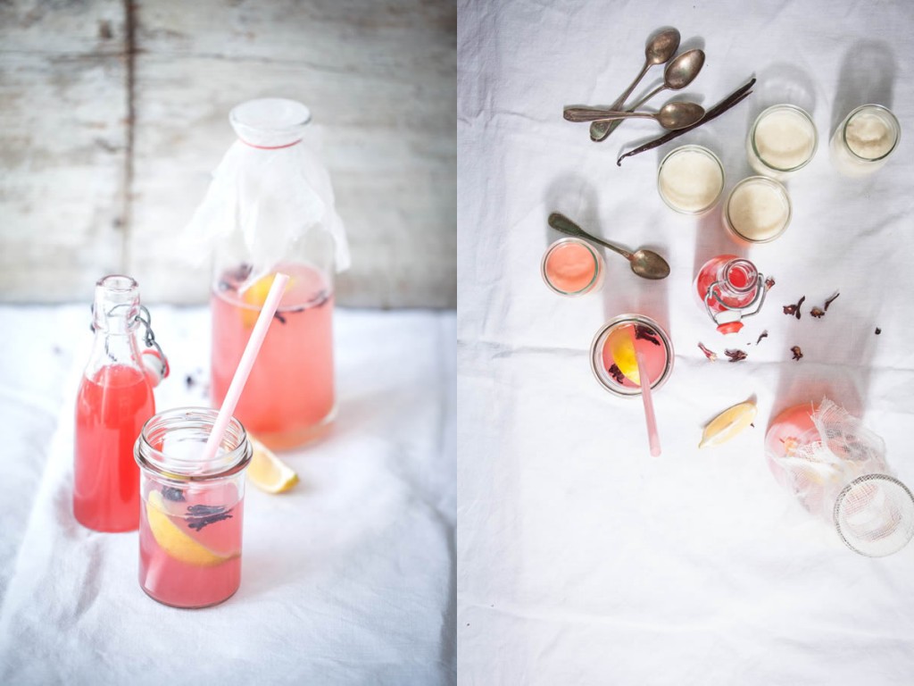J’ai choisi la rhubarbe parce que le sirop de rhubarbe n’existe pas (à ma connaissance) dans les magasins, mais les autres fruits feront aussi bien l’affaire (je vais d’ailleurs essayer très vite le cassis). Quant à l’hibiscus, il ajoute sa note acidulée et sa jolie couleur rose à ce sirop léger ultra rafraîchissant.